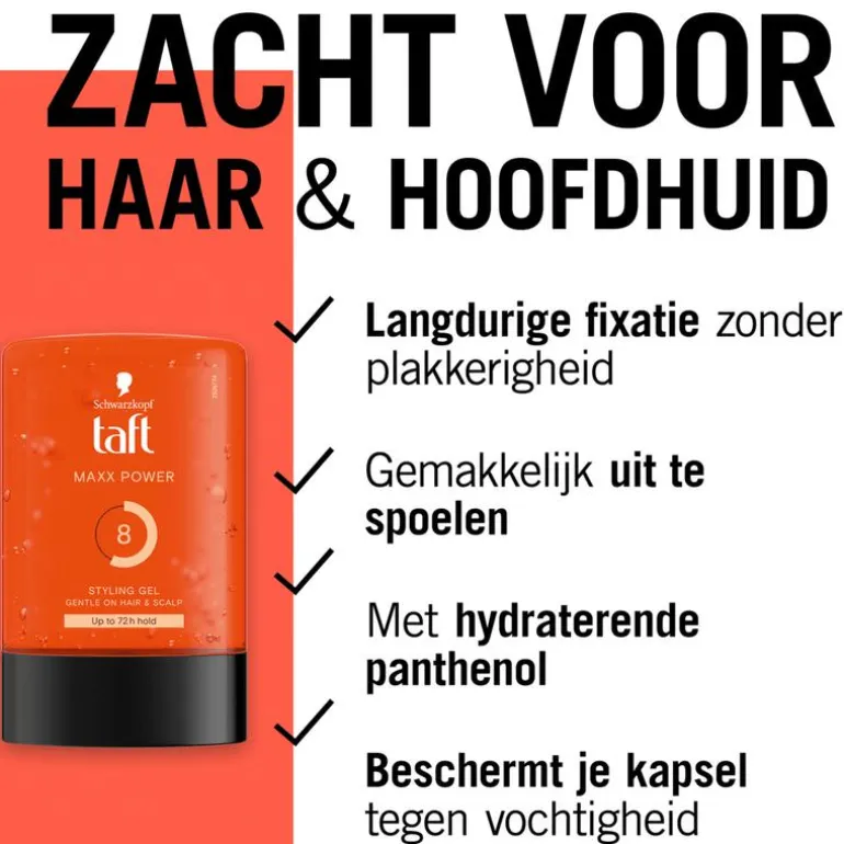 Taft Maxx Power Styling Gel voor maximale sterkte. Het geeft je haar tot 72 uur fixatie. Deze gel plakt niet, is gemakkelijk uit te wassen en is vrij van alcohol (ethylalcohol).