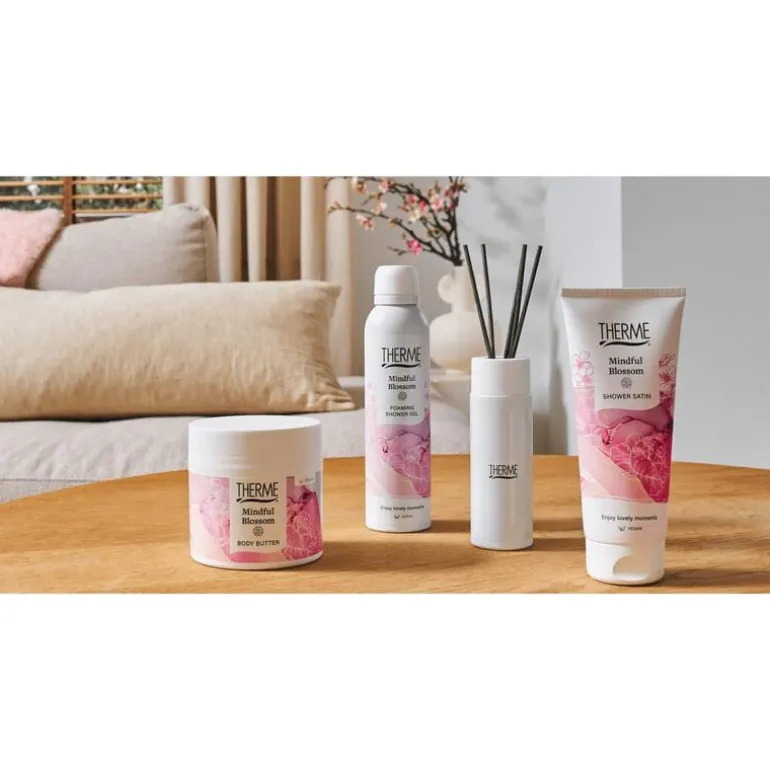 Therme Mindful Blossom is geïnspireerd op de vluchtige schoonheid van bloesem, een symbool voor zachtheid, tederheid en klein geluk. Creëer je eigen wellnessritueel en verwen je huid na het douchen met een Therme Mindful Blossom verzorgingsproduct.