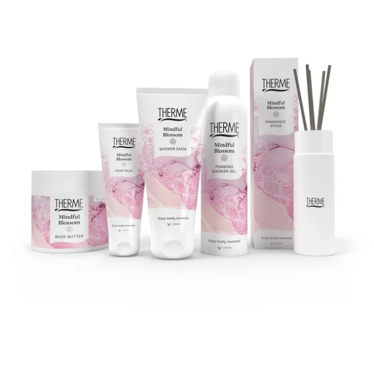 Therme Mindful Blossom is geïnspireerd op de vluchtige schoonheid van bloesem, een symbool voor zachtheid, tederheid en klein geluk. Creëer je eigen wellnessritueel en verwen je huid na het douchen met een Therme Mindful Blossom verzorgingsproduct.
