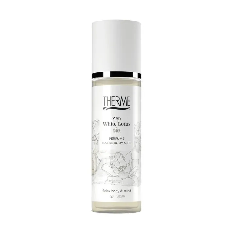 Creëer een feel-good moment en prikkel je zintuigen met deze luxe wellness beleving. THERME Zen White Lotus Perfume Hair & Body Mist is een parfumerende spray voor haar en lichaam.De mist heeft een verfrissende en hydraterende werking. Geniet van de serene geur van witte lotus gecombineerd met aromatische jasmijn en subtiele witte musk.