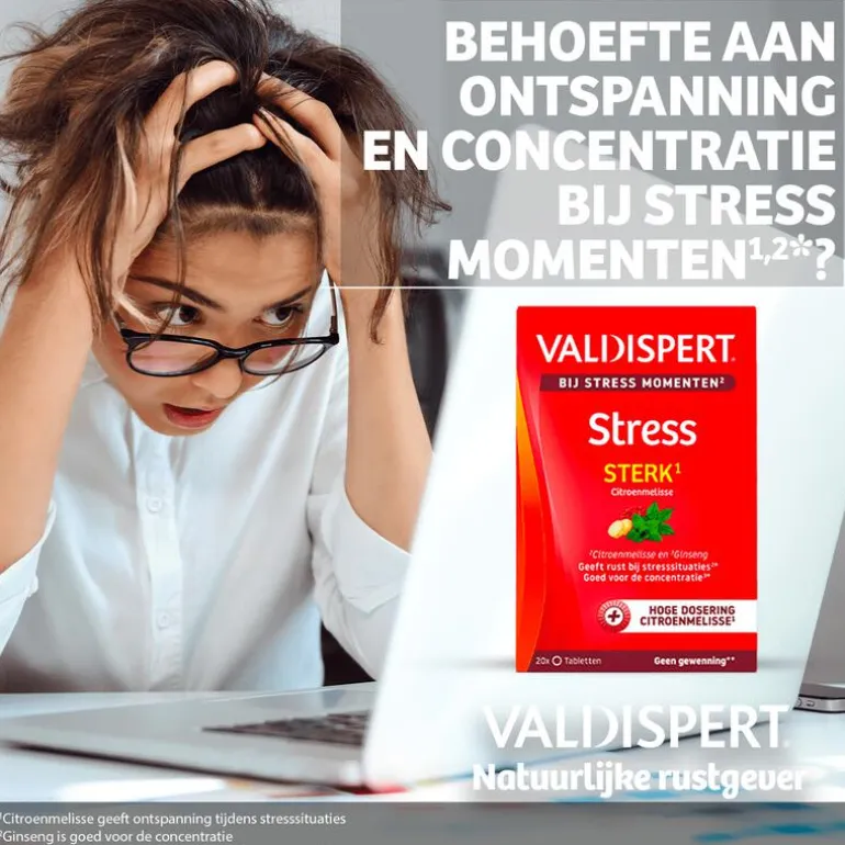 Dosering: bij een stresssituatie, een zenuwachtig gevoel en/of innerlijke onrust 1 tablet in te nemen. Maximaal 3 tabletten per dag innemen. Eén tablet bevat 449mg valeriaanwortel, 400mg citroenmelisse, 90mg ginseng, 200µg folaat (100% RI), 10mg zink (100%RI) en 1,4mg vitamine B6 (100% RI). De maximale aanbevolen dosering niet overschrijden. Slik het tablet in z’n geheel door, bijvoorbeeld met water. Dit is een voedingssupplement op basis van planten, een vitamine en mineraal. Zorg voor gevarieerde, evenwichtige voeding en een gezonde levensstijl: een supplement is een aanvulling van een gevarieerde voeding, geen vervanging. Houd het middel buiten bereik van kinderen. Dit voedingssupplement is niet geschikt voor kinderen onder de 12 jaar, bij zwangerschap en bij borstvoeding. Geschikt voor vegegatiërs en veganisten.