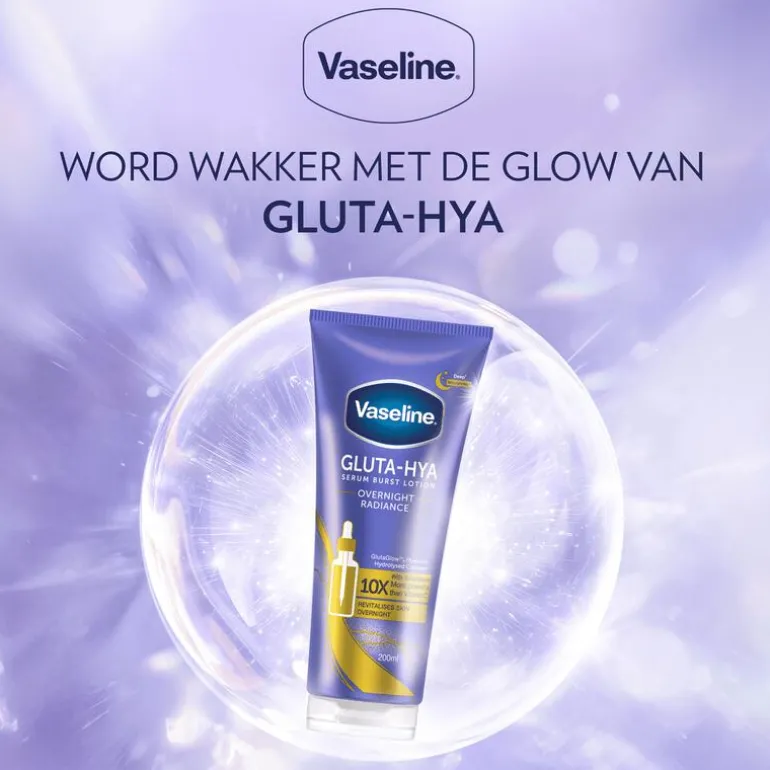 Wij geloven dat iedereen, overal een gezonde huid verdient. Vaseline Gluta-Hya Overnight Radiance Serum Burst Lotion helpt je een gezond uitziende, stralende huid te krijgen. De bodylotion bevat GlutaGlow-technologie, met antioxidanten die 10 keer krachtiger zijn dan vitamine C*. Het hyaluronzuur in de lotion verbetert het vochtgehalte van de huid en het gehydrolyseerde collageen geeft de vermoeide huid meer stevigheid. De unieke formule, die ook Vaseline Petroleum Jelly bevat, spat uiteen in waterdruppeltjes en wordt onmiddellijk en diep** opgenomen. De lotion laat een zacht, fluweelachtig gevoel achter, transformeert je huid ’s nachts en maakt een vermoeide huid steviger in vijf dagen. *In-vitrotest. Van Gluta-Hya antioxidanten is aangetoond dat ze 10x beter werken dan vitamine C. **Binnen de hoornlaag.