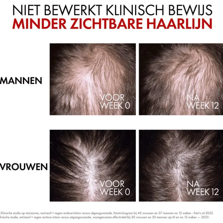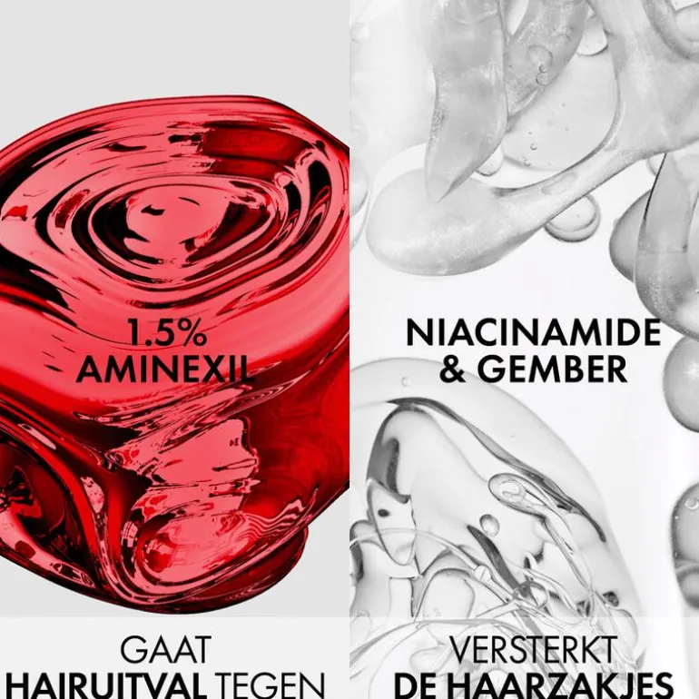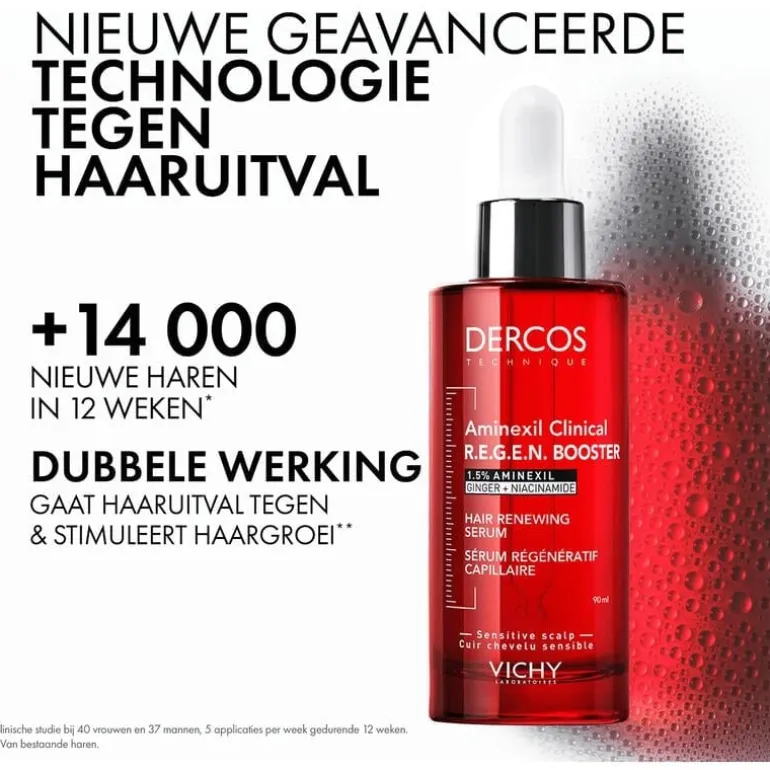 Vichy Dercos Aminexil Clinical R.E.G.E.N. Booster Serum is een geavanceerd haarserum dat haaruitval helpt verminderen en de haargroei stimuleert*. De formule combineert 1,5% Aminexil met gemberextract en niacinamide voor een dubbele werking: het ondersteunt de verankering van het haar in de hoofdhuid en bevordert een gezonde haargroei*. Het serum versterkt de haarvezel, geeft meer volume en glans, en draagt bij aan een vollere haardos. Geschikt voor dagelijks gebruik op droog of vochtig haar, voor zichtbaar sterker en vitaler haar. Vichy Dercos Aminexil Clinical R.E.G.E.N. Booster Serum biedt een gerichte aanpak bij haaruitval en dunner wordend haar. De combinatie van Aminexil, gemberwortel en niacinamide helpt de haarwortel te beschermen, stimuleert de hoofdhuid en ondersteunt de natuurlijke haargroei. Dit anti-haaruitval serum voedt en versterkt het haar vanaf de aanzet, waardoor het er voller en gezonder uitziet. Voor het beste resultaat wordt aangeraden het product 5 tot 7 keer per week aan te brengen, verdeeld over vier secties van de hoofdhuid. Ideaal in combinatie met Dercos shampoo voor een complete haarverzorgingsroutine. *Bestaand haar.