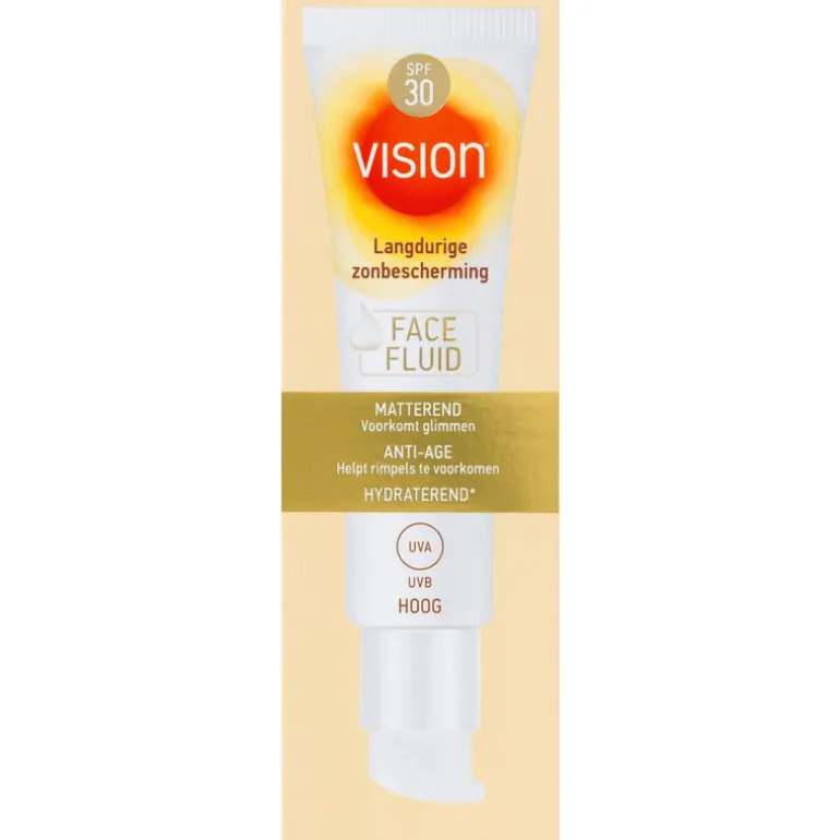 Vision Face Fluid SPF 30Langdurige zonbescherming voor je gezicht. Anti-age, matterend en hydraterend*.*met hydraterende bestanddelen• Langdurige zonbescherming voor je gezicht • Matterend: voorkomt glimmen• Anti-age: helpt rimpels te voorkomen• Met hydraterende bestanddelen• Zeer waterbestendig• Met 5-sterren UVA-bescherming • Met LipoDefense TechnologyTMWe houden allemaal van de zon, maar zijn ons ook bewust van de schadelijke effecten. Je gezicht wordt heel vaak blootgesteld aan zonlicht en verdient daarom extra aandacht. Vision Sun Face Fluid is het ideale zonproduct voor je gezicht. De complete All-in-1 formule matteert en hydrateert de huid én helpt huidveroudering te voorkomen dankzij extract van gouden zeewier. De optimale balans tussen UVA- en UVB-filters zorgt voor een zeer hoge bescherming tegen de zon en helpt rimpels te voorkomen. Daarnaast is de Face Fluid ook perfect te combineren met cosmetica.*met hydraterende bestanddelen