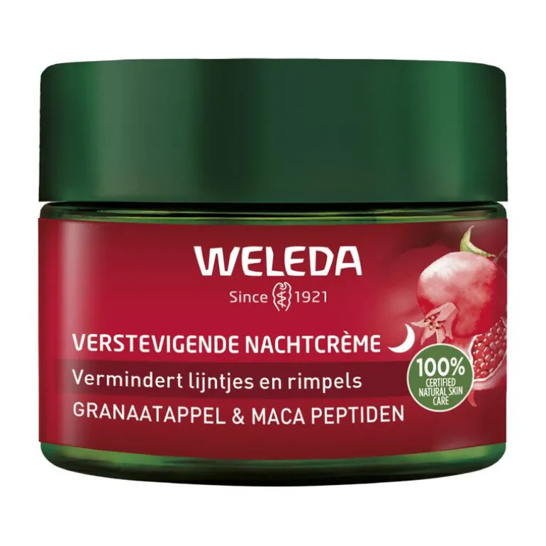 Weleda Verstevigende Nachtcrème verstevigt de huid door middel van krachtige antioxidanten als biologische granaatappelpitolie en peptiden van macawortel die de celvernieuwing stimuleren. De volledig natuurlijke formule voedt intensief en vermindert lijntjes en rimpels. Met als resultaat ‘s ochtends een stralende en stevige huid.
