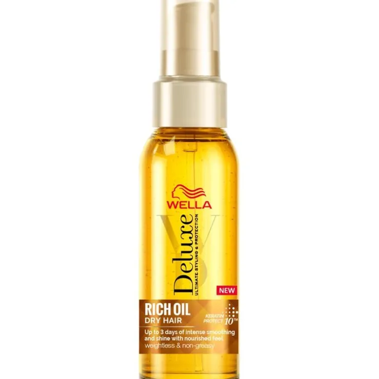 Doordrenkt met een mix van voedende oliën, biedt Wella Rich Oil for Dry & Damaged Hair je haarstijl 10 voordelen: anti-breuk, voeding, gladheid, UV-bescherming van het haar, zacht gevoel, gemakkelijker kammen, ontwarren, anti-pluis, glans en handelbaarheid. Tot wel 3 dagen intense glans en verzorging, voor een elegante finish.