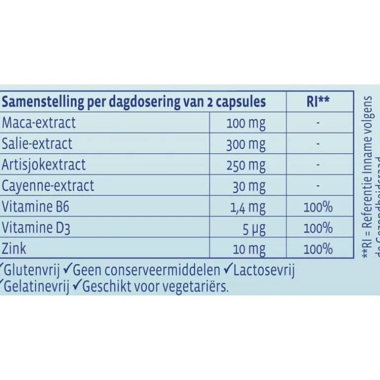¹Salie: Helpt bij opvliegers en nachtelijk transpireren*. Ondersteunt bij een rusteloos gevoel, stemmingswisselingen en prikkelbare gevoelens*.²Maca: Helpt moeheid te verminderen en ondersteunt bij stresssituaties*. Goed voor het energieniveau en draagt bij aan een positieve stemming*. Zink en Vitamine B6: Goed voor de hormoonhuishouding. ³Cayenne: Draagt bij aan vetverbranding en gewichtsverlies*. Ondersteunt behoud van het silhouet*.⁴Artisjok: Goed voor het behoud van een gezonde spijsvertering*. Vitamine D3 & Zink: Dragen bij aan het normaal functioneren van het immuunsysteem. ⁵Zink: Goed voor de haren en nagels. Helpt bij het gezond houden van de huid. ⁶Vitamine D3: Ondersteunt behoud van sterke botten en spieren.*Gezondheidsclaim in afwachting van Europese toelating.