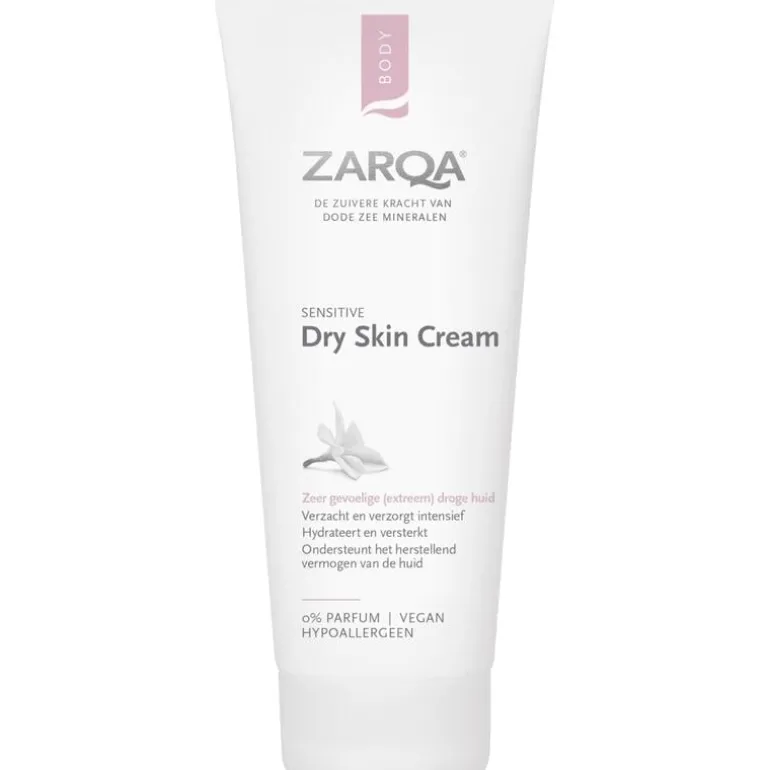ZARQA Dry Skin Cream is een verzachtende en intensief hydraterende crème voor de rode, droge, schrale, ruwe en gevoelige huid. De voedende crème met mineralen uit de Dode Zee is speciaal ontwikkeld voor de dagelijkse verzorging en bescherming van de (extreem) droge huid. Het smeert gemakkelijk uit en trekt snel in. Het bevat een natuurlijk zilvercomplex, zink, panthenol en vitamine E. Zilver en zink geven de huid extra ondersteuning om te herstellen. Panthenol verzacht en verzorgt de rode geprikkelde huid. Vitamine E is een krachtig anti-oxidant en heeft een intensief voedende en hydraterende werking. Deze formule helpt de natuurlijke huidbarrière te versterken en de vochtbalans te verbeteren.